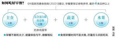 《中国居民膳食指南(2022)》建议,早餐要保证食物多样,最好4类品种以上,至少包括主食1份、奶类鸡蛋等富含蛋白质的食物1份、蔬菜水果各1份,以保证获得的营养物质全面充足。