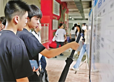 下午3时,考生核对身份信息后,走进武汉市七一中学考点大门,随即通过一条避雨棚直接走到教学楼大厅。大厅中醒目地张贴着考场安排一览表、考场安排平面示意图、考场规则等信息。该考点共设28个考室、2个备用考室,将有827名考生在此完成中考。