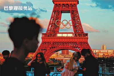 6月22日,在法国巴黎,人们在悬挂奥运五环标志的埃菲尔铁塔附近休闲。巴黎奥运会将于7月26日至8月11日举行,巴黎奥运氛围日益浓厚。