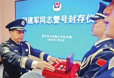 武汉晚报讯(通讯员胡子昂 记者陈勇)“我宣布,封存邱建军同志生前使用警号:025881!”“敬礼!”7月9日上午,武汉市公安局党建中心庄重肃穆,浴血追凶、壮烈牺牲的邱建军同志的警号封存仪式在这里举行,其生前战友和妻子女儿现场见证了全部过程。