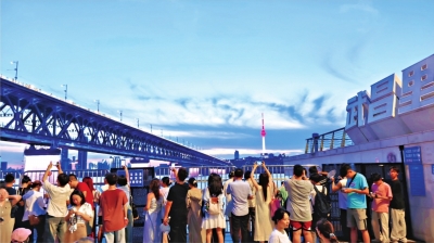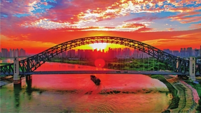 在武汉长江大桥桥头堡下,河南南阳游客张女士用手机拍下江面上的落日,“武汉的天空,真的好美。随手一拍,都是大片的感觉”。