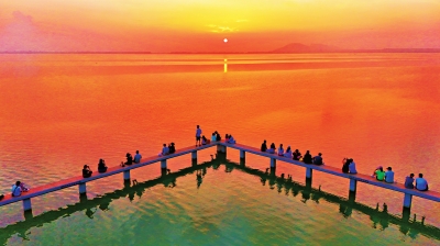 蓝天之上,云的形状不断变幻,在东湖南路的凌波门栈桥上,赶来看日出、云海的人络绎不绝。