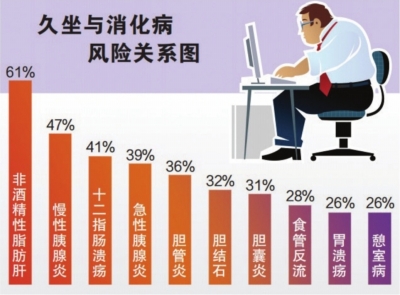 此次新研究发现,在久坐可能导致的16种消化系统疾病中,非酒精性脂肪肝(61%)、慢性胰腺炎(47%)和十二指肠溃疡(41%)的发病风险最高。刘大铭表示,研究结果与临床情况基本相符,患者多为互联网从业人员、办公室职员、会计、编辑、教师等。