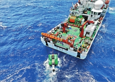 据新华社电 记者7月9日从上海市政府举办的发布会获悉,中国深海矿产资源开发关键技术研究与装备研制取得重大突破,由上海交通大学自主研制的深海重载作业采矿车工程样机“开拓二号”日前成功完成海试(右图)。“开拓二号”连续完成5次着底采矿,取回深海多金属结壳与结核,实现深海重载作业采矿车海试水深首次突破4000米,最深达4102.8米,在国内首创深海复杂海底地形高机动行进、深海多矿类复合钻采等深海采矿领域多项技术。