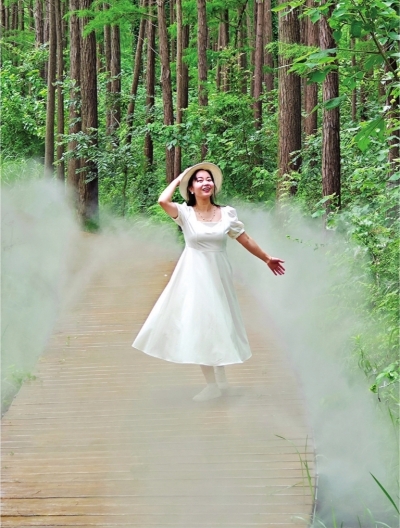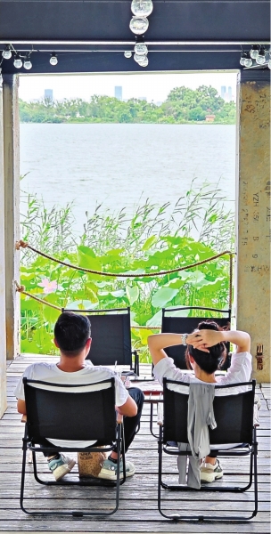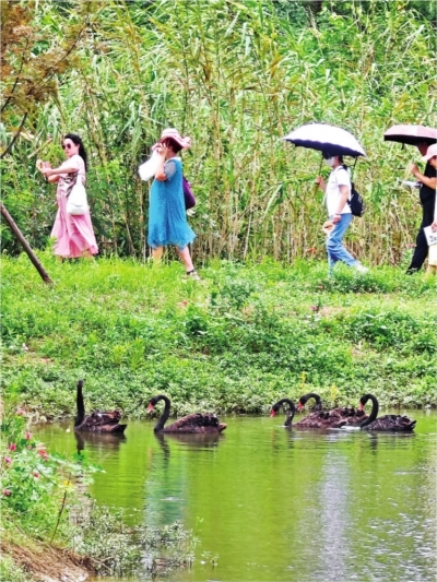 记者了解到,整个岛屿划分为文化表演区、智慧研学区、沉浸观雁区和湖滨休憩区四大功能区域。游客沿着湖岸漫步,动物大观、雁栖畔营地、雁语轩、落日情书、原生湿地、秘境雾影、雁岛集市等景点依次呈现在眼前。在雁栖畔营地,不少游客已在此休闲露营起来,点上几杯饮品,面向湖水坐上躺椅,吹着湖风听鸟鸣,好不自在。“我们在社交网络上看到了‘大雁伴飞’的视频,特意坐高铁来玩!”来自湖南的杨女士和朋友在东湖生境雁岛畅游着,路过秘境雾影区域时,正好碰上雾气弥漫,忍不住在杉林栈道间拍起照片和视频。“这片小岛很有野趣,好像真的进入原始湿地中,有很多东西可以去探索,很好玩,不虚此行!”