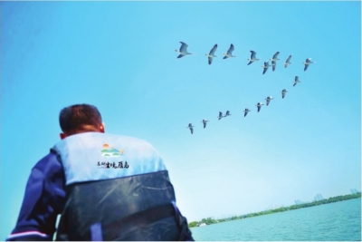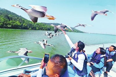 大雁的飞行速度是每小时68~90公里,与大雁一起飞行是一种什么样的体验?18日上午,记者抵达东湖生境雁岛,一艘快艇载着游客在湖面上驰骋,数十只大雁跟随快艇,时而排成“人”字,时而排成“一”字,陪着游客一同在东湖水上畅游。