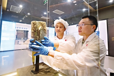 在三星堆博物馆文物保护与修复馆,工作人员在布置展品(7月21日摄)。7月23日,“匠心妙手——三星堆遗址新出土文物保护修复成果展示”在四川广汉三星堆博物馆文物保护与修复馆正式开幕,展示近一年来三星堆新出土文物保护修复成果,讲述文物保护背后的故事。