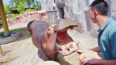 “进入夏季,我们会对动物的饲料比例进行调整,增加西瓜等一些夏季应季水果的比例。”营养师刘浏介绍,从7月初到8月底,动物们大概每日要食用约130斤西瓜,保育员会定时给黑熊、非洲象、白犀、河马、南美貘和大部分的灵长类动物投喂大西瓜。
