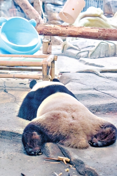 大熊猫“武林”和“盟盟”搬进了大熊猫馆内场馆,保育员给它们全天候开放空调。