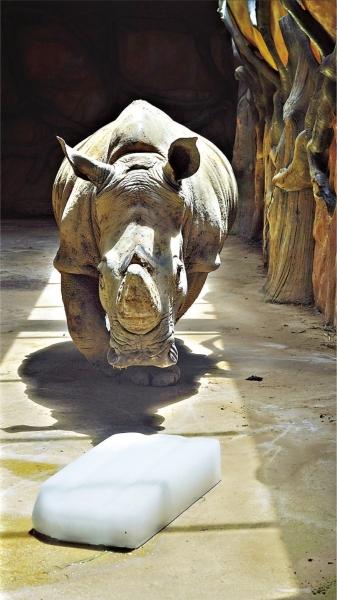 在武汉动物园非洲区马赛马拉的白犀内展区,一只白犀在阳光照射下一步步走向放在角落的大冰块,舒服地靠在旁边休息。