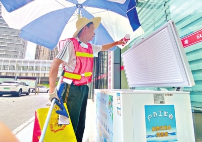 武汉晚报讯(记者高萌 通讯员郭佳 任昊)“刚工作完,一口冰水下肚,太舒爽了!”8月2日中午,刚打扫完路面的环卫工人万清华,直奔武昌区徐家棚街道秦园路社区新时代文明实践站,熟练地从门口冰柜中拿出一瓶冰镇矿泉水,一饮而尽。