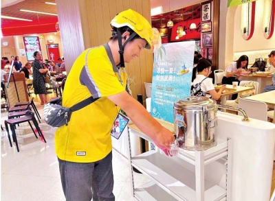 在中商世界里(销品茂),不少门店设有“致敬每一滴汗水,请骑手喝冰饮”的温馨提示语。“看到他们这么辛苦,我们只是想尽一份绵薄之力,让他们感受到社会的温暖。”付先生在成都(中商里店)的肖经理说,每次碰到外卖小哥火急火燎地赶来取餐,服务员都会特意提醒他们“过来喝杯酸梅汤,消消暑”。