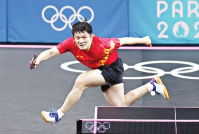 8月4日,樊振东在比赛中。当日,在巴黎奥运会乒乓球男单决赛中,中国选手樊振东4比1战胜瑞典选手莫雷高德,夺得金牌。