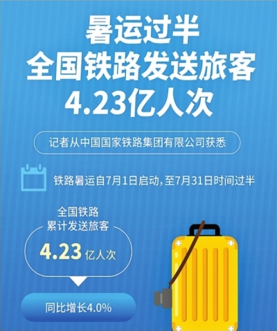 据新华社电 记者从中国国家铁路集团有限公司获悉,铁路暑运自7月1日启动,至7月31日时间过半,全社会跨区域人员流动量稳中有增。全国铁路累计发送旅客4.23亿人次,同比增长4.0%,日均发送旅客1363万人次,铁路运输安全平稳有序。