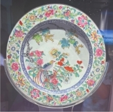 眼前一只乾隆年间的花鸟纹盘,盘心绘山茶花锦鸡图,一对锦鸡立于枝头,白、粉、红、黄四色茶花围绕在旁。口沿处一圈缠枝花卉,绘有蜀葵、牡丹、菊花等。盘底中心绘西洋花草藤蔓,外壁为牡丹、月季和蜀葵三组折枝花卉,间绘有天牛、蚂蚱和蝴蝶三只昆虫。工作人员说,锦鸡常与牡丹、山石组成吉祥图样,寓意大吉富贵。