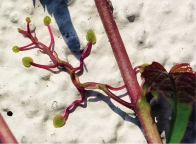 吸盘不仅通过“物理防御”使其结构牢固,还借由“化学魔法”协同增加吸附力。在爬山虎向上攀爬的生长过程中,吸盘能够从其内部微孔中分泌一种粘液,一旦吸盘遇到墙面,一种缓慢的化学反应便开始发生,使吸盘牢牢吸住墙面。因此,当吸盘与墙面接触后,随着吸盘尖端受到持续的接触刺激,分泌物也源源不断产生,促使部分空气被“包裹”在吸盘里,而吸盘生长过程中会逐渐消耗掉“包裹”在吸盘中空气的氧分,导致吸盘内形成负压,从而增加吸盘与墙面之间的附着力。