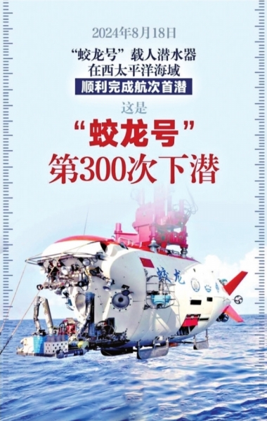 自2009年8月首次在长江江面完成下潜测试,2012年7月在西太平洋马里亚纳海沟完成7000米级海试,2017年进行全面技术升级,今年上半年首探大西洋并创下“九天九潜”新纪录,如今顺利完成第300次下潜……“蛟龙号”已在太平洋、印度洋、大西洋的海底留下足迹,彰显中国深潜的实力,实现“可上九天揽月,可下五洋捉鳖”的夙愿。