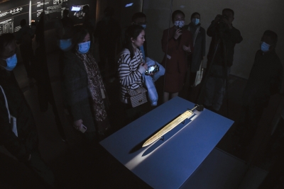 其中,越王勾践剑因制作精美,历经2500余年仍纹饰清晰,毫无锈蚀,被誉为“天下第一剑”。这把剑在出土时插在漆木剑鞘里,出鞘时仍然寒光闪闪,耀人眼目,其剑刃薄而锋利,经测试它能够一次轻松地划开20张白纸。