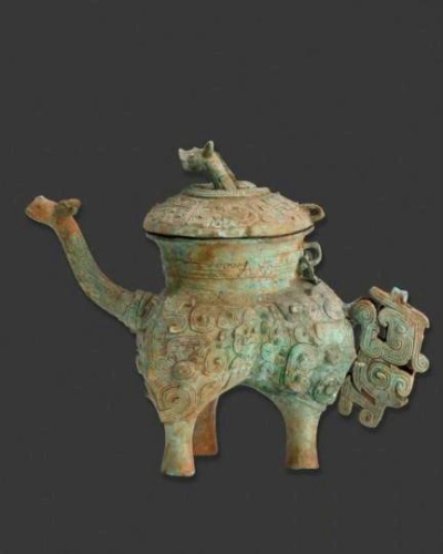 还有被写进历史教科书的国宝—四羊方尊,在现存商代青铜方尊之中体型最大。它造型雄奇,肩部、腹部与足部作为一体被巧妙地设计成四只卷角羊,各据一隅,在庄静中突出动感,匠心独运。