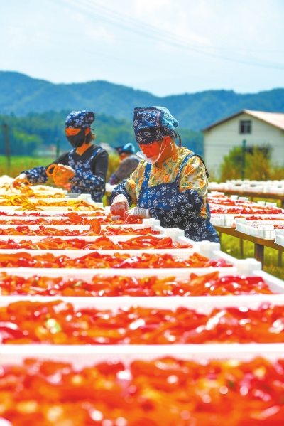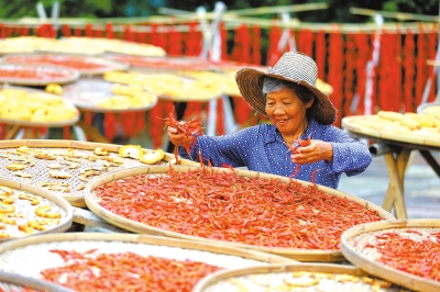 8月19日,在安徽省黄山市徽州区呈坎村,村民在晒场上晾晒红辣椒。