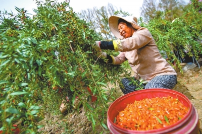 8月7日,在德令哈市,采摘工人采摘成熟枸杞。