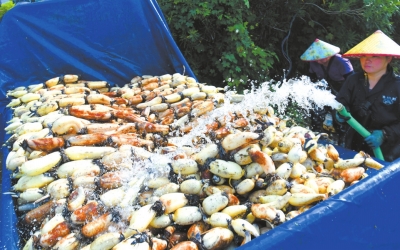 8月14日,在江苏省无锡市惠山区玉祁街道黄泥坝村,藕农冲洗莲藕。