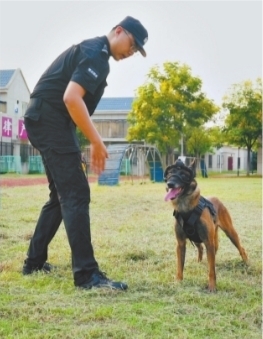 8月29日下午,记者在警犬基地参观机犬合演时看到,“哮天犬”头戴黑盔、身穿黑色马甲,全副武装,威风凛凛。