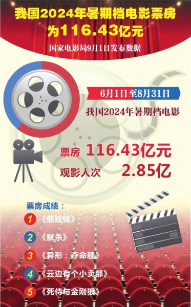国家电影局1日发布数据,2024年6月1日至8月31日,我国暑期档电影票房为116.43亿元,观影人次为2.85亿;国产影片票房为84.81亿元,占比为72.84%。其中,《抓娃娃》《默杀》《异形:夺命舰》《云边有个小卖部》《死侍与金刚狼》位列暑期档票房榜前五位。