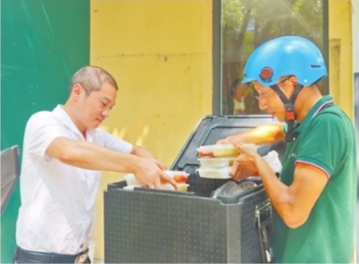9月14日上午9时,江汉区万松街智慧居家养老服务中心门口,送餐员李伦和负责人文元将盒饭装进电动车的箱子里,准备为社区里80多名老人送餐。