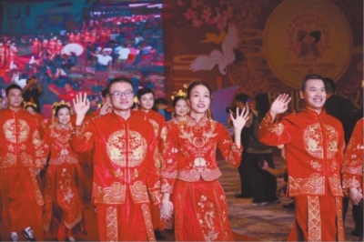 在集体婚礼活动武汉分会场,现场满是科技感、浪漫感,设置了红黄相间的户外主题门楼,背景以黄鹤楼等地标建筑穿插,并运用光影技术投射下7米长的传统“婚书”。