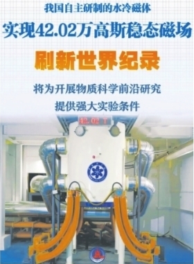 据介绍,地球磁场约为0.5高斯,42.02万高斯相当于地球磁场的80多万倍,标志着我国乃至世界水冷磁体技术发展的新高峰。