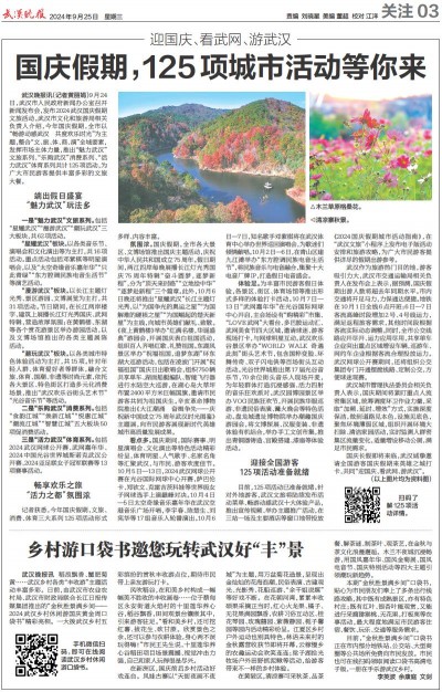 武汉晚报讯 稻浪飘香、蟹肥菊黄……武汉乡村各类“丰收游”主题活动丰富多彩。日前,由武汉市农业农村局、武汉市财政局联合长江日报传媒集团推出的“金秋胜景满乡间——2024武汉乡村休闲游国庆黄金周口袋书”精彩亮相。一大拨武汉乡村五彩缤纷的赏秋丰收游点位,期待市民带上亲友游玩打卡。