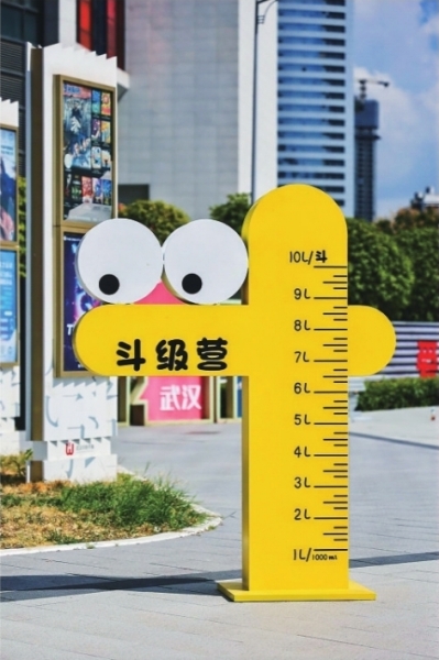 街面上,由青年艺术家、策展人、时尚设计师郑国庆为斗级营设计的拟人化形象“小斗”随处可见。亮黄色的“小斗”正面刻着“10升1斗”刻度线,背后则通过金元宝体现“日进斗金”的概念,传统的“斗”与当代设计结合在了一起。开街前,“小斗”就已在黄鹤楼、昙华林、龟山公园、巴公房子、斗级营等地标“漂流”了一圈,颇受游客欢迎。