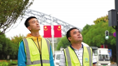 心怀着一份责任,我们仔细学习了升挂国旗的操作规程。双向六车道离地4米,其他路段离地3米……上路前,我把这些规则背得滚瓜烂熟。