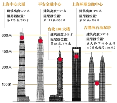 调谐阻尼器则是通过增加一个子结构,把建筑的能量向子结构转移。这些子结构往往都重达数百吨,当台风或地震将大楼晃到一边时,阻尼器也会发生运动,其惯性运动方向和大楼运动方向正好相反。