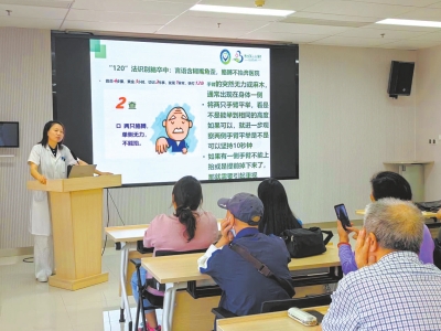 “言语含糊嘴角歪,胳膊不抬奔医院。”陈瑜主任对中风“120口诀”进行了通俗解读。“1”代表“1张不对称的脸”;“2”代表“2只手臂是否出现单侧无力”;“0”代表“聆(0)听讲话是否清晰”。“学会了120口诀,可第一时间识别中风迹象并拨打急救电话120。”她列举了脑卒中发作前可能出现的预警信号,如口眼歪斜、流口水、眼前发黑、胳膊腿无力等,提醒公众在出现这些症状时应立即就医。