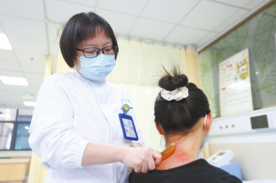 “没想到小小的刮痧板还挺厉害,虽然刮的时候有点痛,但刮完后感觉气血通畅,肌肉松弛了很多,肩颈酸痛感明显减轻。”在武汉市中心医院杨春湖院区中医护理门诊,做完虎符铜砭刮痧的周女士对护理人员赞不绝口。