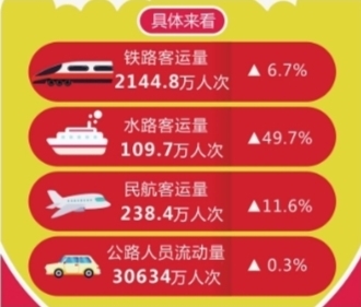 具体来看,铁路客运量2144.8万人次,比2023年同期增长6.7%;创单日旅客发送量历史新高,运输安全平稳有序。水路客运量109.7万人次,比2023年同期增长49.7%。民航客运量238.4万人次,比2023年同期增长11.6%。