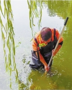 小刘说,他们拨打电话后几分钟,就有两名工作人员拿着工具赶到现场,帮忙打捞手机。可因为湖中水草茂盛,肉眼难以看到手机位置,打捞了10多分钟未果。后来,一位环卫师傅穿着防水衣跳入湖中摸索了近20分钟,终于找到了手机。