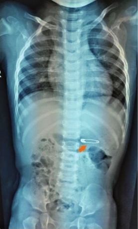 皮皮的爸妈都说没有动过别针,于是全家出动各处翻找,仍不见别针的踪影。“会不会被皮皮吞到肚子里了?”父母随即带着皮皮前往家附近的医院,通过影像检查发现那枚别针果然在皮皮的胃里,医生建议立刻转诊至湖北省妇幼保健院。