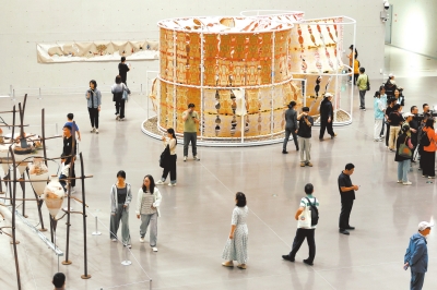 丰富多元的艺术面貌给观众带来艺术盛宴。“武汉双年展令人惊艳!”“00后”肖子涵趁十一假期和朋友来看展,他说,“我们一天逛了武汉美术馆的两大场馆,感受到艺术范十足,意犹未尽。”连日来,在两个展馆内,每个展厅前来观展的观众不仅有年轻的艺术爱好者,还有不少家长带着孩子前来观展,各个年龄群体的观众都在这里找到打动自己的元素。退休老人汪先生是美术场馆的常客,“这个展览带给我很多思考,让我大开眼界。”他说,“有一些作品可能并不是很理解,但这并不重要,重要的是通过和作品的对话,细心感受,能够开启自己的想象力。”网友“柠檬”在微博上向大家分享了她的看展经历,“花了一整天时间看武汉美术馆的双年展,这个展真的非常棒,有非常多很有意思的作品”。