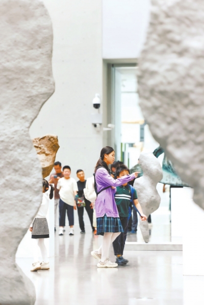 在武汉美术馆(琴台馆)A厅,雕塑作品《启示》是观众必打卡之处。艺术家王思顺在全世界收集像人物肖像的石头。不同大小、形态、颜色、纹理的肖像石头仿佛是来自各种世界和地域、族类和身份、历史和未来的生命。大家穿梭在“石头阵”中,细细品味被时间和自然力量塑造而成的石头雕塑。本届双年展有不少大体量装置类作品,在户外草坪展出的意大利艺术家作品《武汉的钥匙》,高8米、长9米、宽5米,有7吨重;艺术家欧阳春的作品《陨星》由940件青铜件组成,各种形态参差排列……这些作品引来观众纷纷拍照打卡。