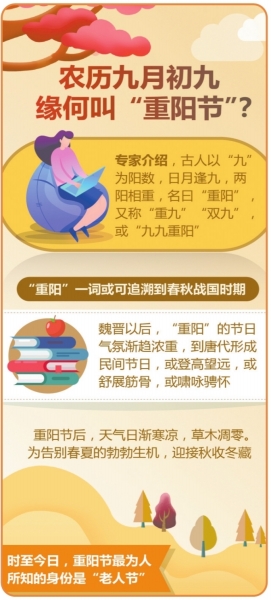 岁岁重阳,今又重阳。到底缘何叫“重阳”?历史学者、天津社会科学院研究员罗澍伟介绍,古人以“九”为阳数,日月逢九,两阳相重,名曰“重阳”,又称“重九”“双九”,或“九九重阳”。