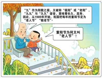 时至今日,重阳节最为人所知的身份是“老人节”。重阳节为何又叫“老人节”?罗澍伟说,“九”作为阳数之极,又被称“极阳”或“老阳”,“九九”与“久久”谐音,意味着长久、高寿。因此,从1989年开始,我国把每年的重阳节定为“老人节”“敬老节”。