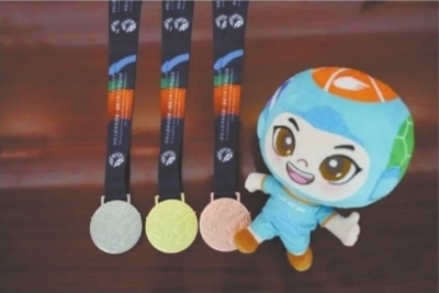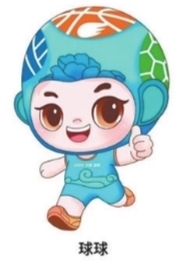 吉祥物“球球”,以主标识的橙、绿、蓝三种颜色为主色调,吉祥物头顶的花环对应湖南的芙蓉花,运动服上的波浪对应湖南的湘江水,寓意本次运动会以湘江水旁的长沙和岳阳为两大主赛场。
