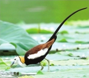 水雉是中等涉禽,其尾羽特别细长,自带飘逸的弧度;其脚爪细长,喜欢在莲叶、菱角、睡莲等浮叶植物上“凌波微步”,因此拥有“凌波仙子”和“水中凤凰”的美誉。