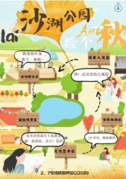 “我把打卡地和观景地都囊括进去了,最推荐的是紫薇苑,那里拍照很出片。”来自广告系的潘怡君是黄鹤楼公园游园图的主创人员,在图上除了交通信息,还特别备注了一句打卡推荐语:赏秋宝地,楼山江于一体。