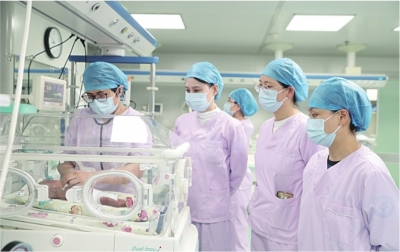 仅在妈妈肚子里待了29周的乐乐(化名),出生体重只有1070克。由于早产,肺部发育不成熟,出生后便出现新生儿呼吸窘迫综合征。经过及时保暖、复苏抢救后,新生儿科用转运温箱将他转至新生儿科重症监护室救治。新生儿科主任姜红带领团队立即给予气管插管呼吸机辅助通气,并从气管内注入肺表面活性物质促进肺膨胀,改善肺通气功能。