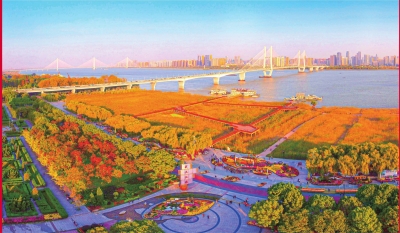 秋日的汉口江滩层林尽染,漫江碧透,一派人与自然和谐共生的壮丽景象。