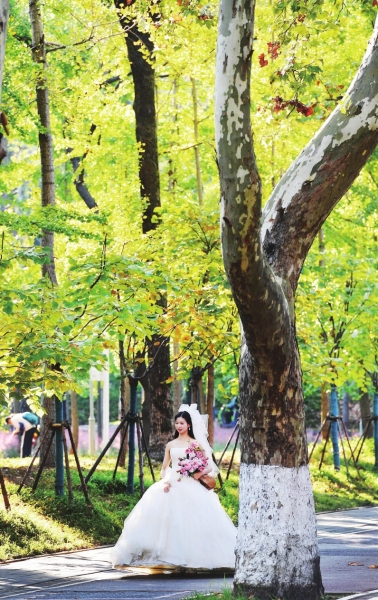 在梧桐树大道上拍摄婚纱照,留下人生最美的风景。